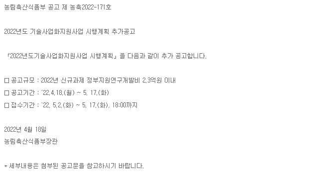 농림식품기술기획평가원, 2022년도 기술사업화지원사업 시행계획 추가 공고