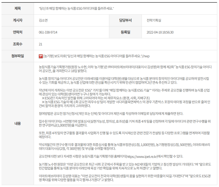 농림식품기술기획평가원 “당신과 매일 함께하는 농식품 ESG 아이디어를 들려주세요.”
