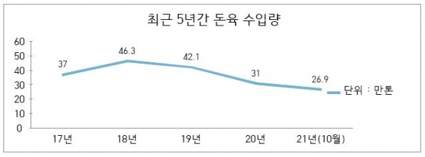 지난 6월 처음으로 돼지고기 수입량이 지난해 동월 수준을 넘어선 이후 7월을 제외하고 3개월 내리 작년 수입량을 뛰어넘은 것이다. 지금 추세대로라면 지난 18년 46만3천여톤서 19년, 20년까지 2년 연속 감소하던 돼지고기 수입량은 올해 3년만에 다시 증가세로 돌아설 것으로 보인다.