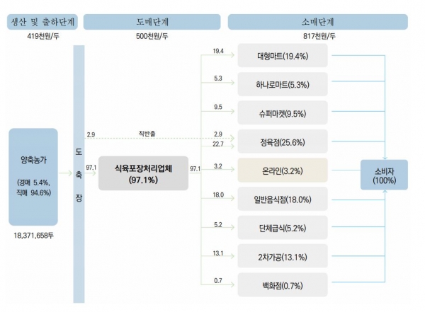 즉 한돈은 도매단계를 거쳐 소매단계에서 대형마트 및 기업형 슈퍼마켓, 그리고 정육점에서 약 60%가