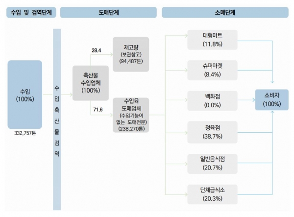 △수퍼마켓 및 하나로마트=14.8% △2차 가공업체‧기타=13.1% △단체급식=5.2% △백화점=0.7%